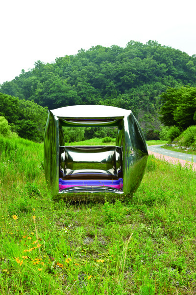 이번 전시에는 건물 외부에 대형 조각이 설치된다. 스테인리스 스틸 표면의 빛 반사를 통해 역설적으로 건축물과 작품 앞을 지나는 많은 사람들을 그 표면 위에 압축적으로 담아낸 작업이다.