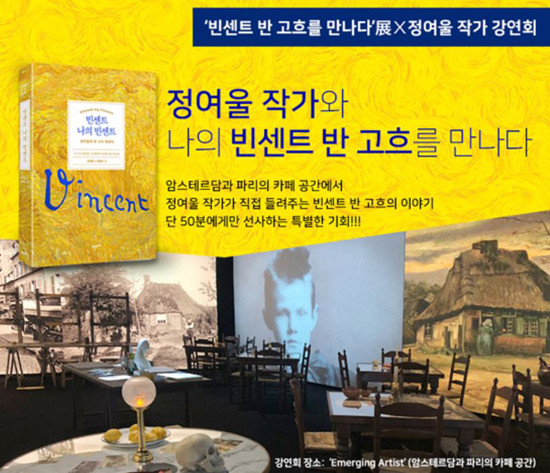 이번 강연회는 10년 동안 반 고흐의 흔적을 찾아다닌 ‘빈센트 나의 빈센트’의 저자 정여울이 전시장 내 암스테르담과 파리의 카페 공간에서 반 고흐에 대해 강연하는 이벤트다. 선착순 50명을 대상으로 하는 이번 이벤트는 오후 7시 30분부터 한 시간의 전시 관람과 오후 8시 30분부터 9시 30분까지 진행되는 강연회, 이후 작가의 사인회로 구성된다. 이벤트에 참여하는 관람객들에겐 정여울 작가의 저서 ‘빈센트 나의 빈센트’가 선물로 제공된다. ‘빈센트 반 고흐를 듣다’ 티켓은 7월 18일 오전 11시부터 인터파크 티켓에서 구매할 수 있다.