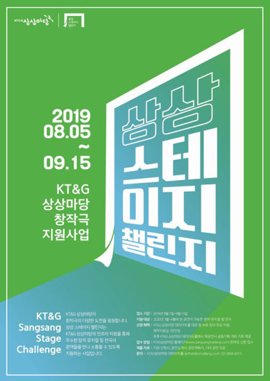 KT&G 상상마당은 국내 창작극 지원 프로그램 ‘상상 스테이지 챌린지’의 지원 작품을 8월 5일~9월 15일 KT&G 상상마당 홈페이지를 통해 공개 모집한다.