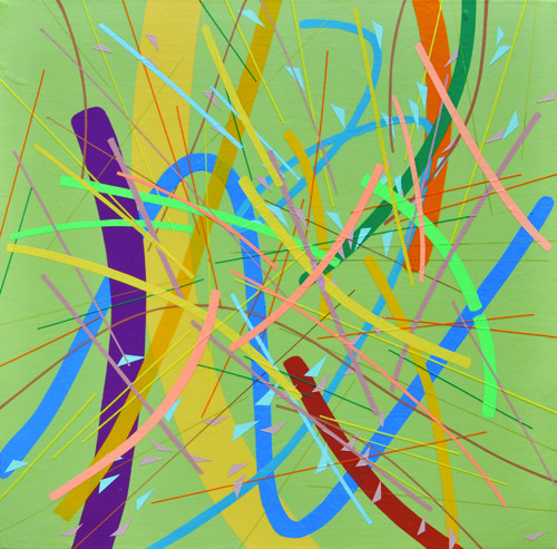 또한 작가는 정지 상태나 고착을 상징하는 점보다는 계속해서 이동하는 선에 집중한다. 이동한 경로를 표시하며 방향성을 가지는 선은, 화면의 어느 지점으로 모이지 않고 공간을 자유롭고 불규칙적으로 횡단한다. 김치현 큐레이터는 “선의 양쪽은 과거부터 현재라는 시간성을 나타낸다. 규칙에서 벗어난 횡단을 통해 뜻밖의 지식을 생성하는 선이 있다. 클리나멘(clinamen)이 그렇다”며 “작가는 팡파르라는 소재를 통해 작품을 관람하는 이들의 저마다 다른 기억 속 어느 순간-시간을 현재로 끌어오며 작업이 사람들의 과거와 현재를 이어주는 연결부가 되길 바란다”고 설명했다.