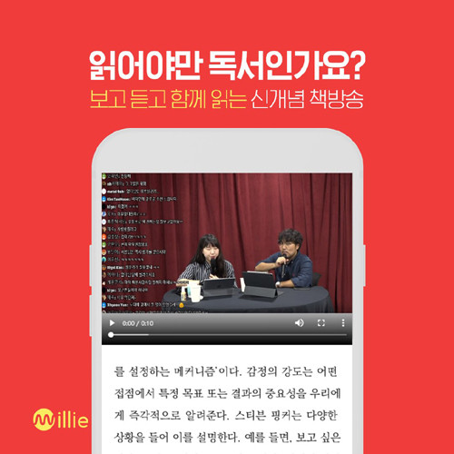 밀리 라이브는 유튜브 크리에이터와 참여자들이 스트리밍 방송을 통해 실시간으로 책을 함께 읽는 서비스다. 8월 8일 유튜버 ‘레고도사꾸비’를 시작으로 ‘초코붕어빵’, ‘김원’, ‘겨울서점’ 등 다양한 크리에이터들이 매일 다른 책으로 라이브 방송을 한다. 크리에이터는 책 내용에 자신의 생각을 더하는 방식으로 책을 소개하고, 참여자들은 자신의 의견을 댓글로 달아 소통한다. 생방송 중에도 참여자가 영상 속 책 내용을 전자책 상에서 즉각 확인할 수 있다.