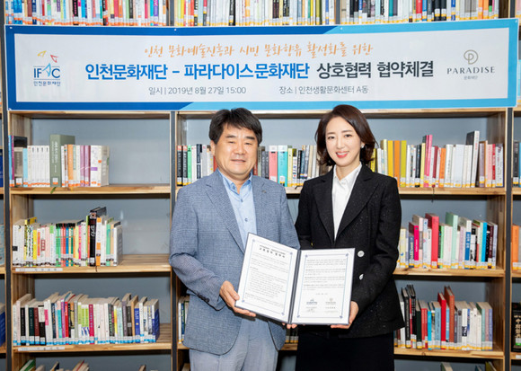 (재)파라다이스문화재단(이사장 최윤정)과 (재)인천문화재단(대표이사 최병국)은 8월 27일(화) 인천생활문화센터에서 문화예술협력네트워크 공동 협업 사업을 위한 업무협약을 체결했다.