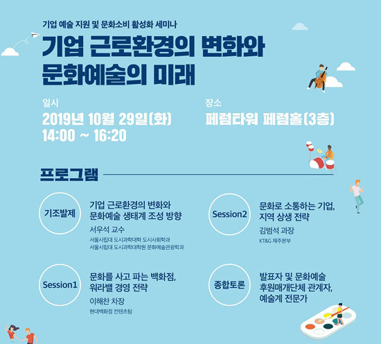먼저 서울시립대 서우석교수가 기조발제를 맡아 ‘기업 근로환경의 변화와 문화예술 생태계 조성방향’을 주제로 워라밸 시대 기업과 문화예술계의 협력 방식 전환 필요성과 상생 방안을 제시한다. 이어 현대백화점 이해찬 차장이 사회 변화에 따른 새로운 문화경영 전략으로써 예술 협력 사례를 발표한다. KT&G 제주본부의 김범석 과장은 문화예술을 통해 다양한 이해 관계자와 소통하고 지역과 상생하는 제주지역 기업 문화공헌 활동을 공유할 예정이다.