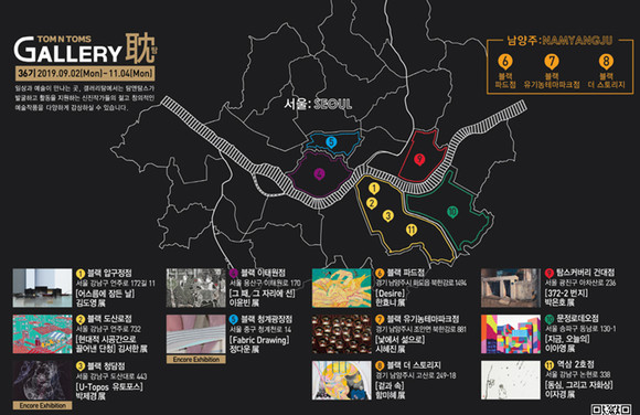 ▲탐앤탐스 블랙 압구정점은 김도영 작가의 ‘어스름에 잠든 날’전 ▲도산로점은 김서한 작가의 ‘현대적 시공간으로 끌어낸 단청’전 ▲이태원점은 이윤빈 작가의 ‘그 때, 그 자리에 선’전 ▲파드점은 한효니 작가의 ‘디자이어(Desire)’전 ▲유기농테마파크점은 시혜진 작가의 ‘낯에서 섦으로’전 ▲더 스토리지점은 함미혜 작가의 ‘겉과 속’전을 진행한다. ▲탐앤탐스 탐스커버리 건대점은 박은호 작가의 ‘372-2번지’전 ▲탐앤탐스 문정로데오점은 이아영 작가의 ‘지금, 오늘의’전 ▲역삼 2호점은 이자경 작가의 ‘동심, 그리고 자화상’전을 선보인다.