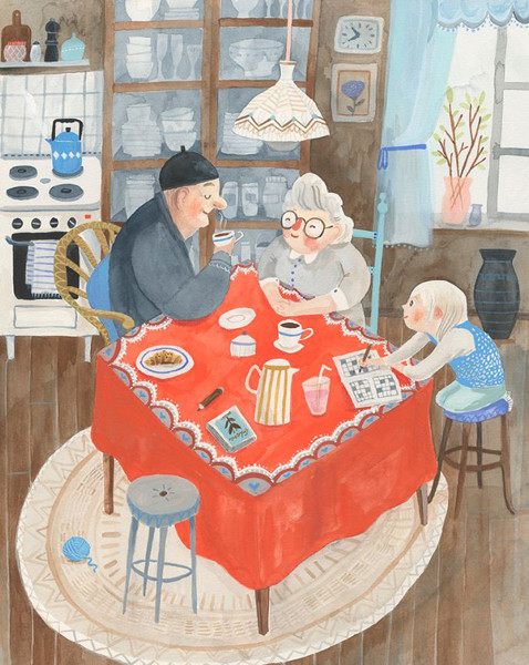 안나 마르그레테 키에르고르는 올해 11월 말에 국내에서 처음으로 국문으로 번역 출간된 ‘잃어버린 토끼, 커피, 눈풀꽃’(2019)에 실린 원화들을 선보인다. 꽃과 퍼즐 놀이를 사랑하던 할아버지가 알츠하이머병으로 인해 말과 기억을 잃어가는 것을 발견한 손녀와 할머니가 할아버지를 위해 좋은 순간들을 만들어가는 아름다운 가족의 이야기를 담은 그림책이다. 안나는 수채화 톤의 블루와 핑크, 오렌지 톤의 색감을 통해 모호하면서도 꿈결 같은 분위기를 자아낸다. 우수가 서려 있는 이야기임에도 불구하고 그 일상 가운데 느껴지는 나른한 행복과 다양한 추상적 감정들을 상상하도록 만든다.