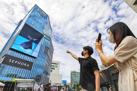 7월 15일 오전 현대백화점 신촌점 유플렉스 외벽에 설치된 디지털 사이니지를 통해 미디어아트 작품들이 선보여지고 있다. 사진 = 현대백화점