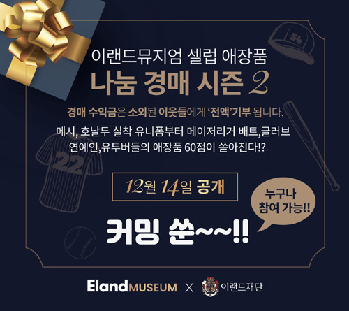 이랜드뮤지엄과 이랜드재단이 연말연시를 맞이해 12월 14~20일 위기 가정 지원을 위한 ‘명사 애장품 나눔 경매 시즌2’를 이랜드재단 인큐베이팅 사이트에서 진행한다. 특히 경매 마지막 날인 12월 20일에는 오후 6시부터 유튜브 ‘이랜드뮤지엄’ 채널에서 윤태진 아나운서의 진행 아래 라이브 경매가 진행된다.