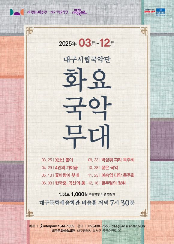 대구시립국악단은 3월부터 12월까지 총 8회에 걸쳐 대구문화예술회관 비슬홀에서 ‘화요국악무대’를 개최한다. 공연은 매회 다양한 주제로 구성되어 국악의 여러 면모를 만나볼 수 있으며, 해설에 중점을 두어 국악에 대한 이해를 돕고 재미를 더한다. 3월 첫 공연은 25일(화) 19:30분 비슬홀에서 열린다.