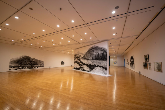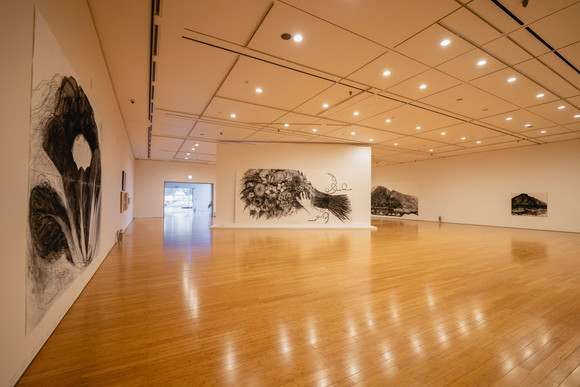 두 번째 장 〈몸과 시간의 흔적- 목탄 벽화〉에서는 신체의 움직임으로 그려낸 대형 목탄 드로잉 벽화가 전시된다. 이 대형 벽화는 긴 막대기에 목탄을 묶어 온몸의 리듬으로 그려내는 수행적 행위로, 완성된 그림은 다시 지워진다. 지우기는 상실이 아닌 존재의 또 다른 지속이며, 이는 시간과 신체의 흔적을 통해 삶의 유한성과 무상의 깨달음을 드러낸다.