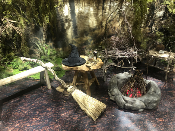 그리고 엘파바의 숲 속 은신처가 이어진다. 실제로 숲에 들어온 듯한 설치물들, 그리고 엘파바의 빗자루 등이 초록색 조경 아래 배치됐다. 이곳에 마련된 책상에선 엘파바의 마법 주문서와 지도, 그리머리 북 등 엘파바의 마법 물품들도 볼 수 있다. 앞선 글린다의 화려한 공간과 대비되는 공간으로 오히려 흥미를 끌어올린다.
