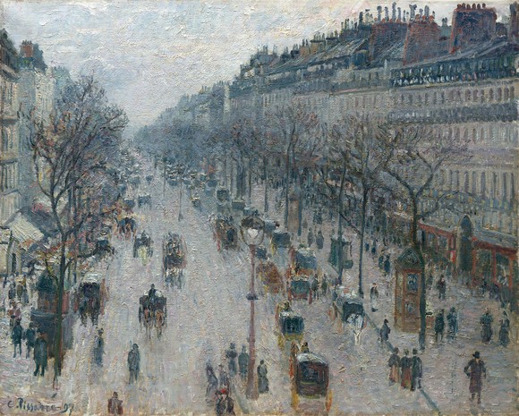 4부에서는 19세기 파리의 사회 문화적인 변화 속에서 어떤 공간성이 나타났는가를 세 가지 주제로 나눠서 보여주는 섹션이다. 그 중 첫 번째가 도시이다. 파리는 사실 길도 굉장히 좁고 구불구불하고 위생 설비도 잘 갖추지 못한 그런 도시였다. 그래서 19세기 중반에 대규모의 도시 재개발이 진행됐다. 광장과 광장을 중심으로 큰 대로가 이어지는 지금과 같은 근대 도시의 면모를 갖추게 된 것은 19세기 중후반이다. 그러면서 이 도시 근대 도시로서의 면모를 갖추게 되자 사람들은 파리라는 도시를 매우 사랑하게 되었다. 그 사람들을 거리에서 관찰하면서 그렸던 화가들도 있었다. 그중 한 점이 카미유 피사로의 작품이다. 그는 호텔방 하나를 잡아 그 위에서 대로를 내려다보며 많은 연작을 남겼다.
