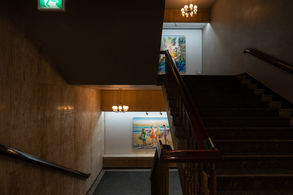 2026 <공연장으로 간 미술> ‘계단 위, 잠시 쉼’은 공간의 구조와 동선을 고려해 회화 작품이 자연스럽게 배치되는 전시로, 관람객이 이동 중 잠시 머물며 작품을 마주할 수 있도록 기획했다.