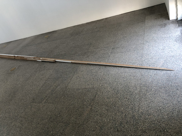 ‘슬리드’는 물렁해 보이는 진지바의 소재와 달리 딱딱한 나무 소재로 이뤄졌다. 위치 또한 창문 높이 솟아난 듯한 진지바와 반대로 바닥에 드러눕혀져 있다. 작가가 칼로 조각을 낸 이 작품 또한 가까이 다가갈수록 날카로운 나무 질감이 돋보이며 색다르게 다가온다. 군데군데 하얀색으로 오일 파스텔 칠도 돼있는데, 하얀 색감으로 인해 창문의 진지바와 연결되는 듯한 느낌도 든다.