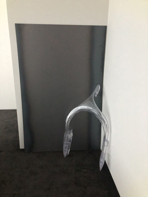 로비 안쪽 마치 숨겨진 듯한 공간에 들어가면 고대영 작가의 작업을 만날 수 있다. 먼저 접하는 ‘헤일로’는 언뜻 보면 기하학적인 설치물로 보이는데, 그 정체는 자동차 부품이다. 헤일로는 경주용 차 조종석 앞면에 붙은 위시본(wishbone) 형태는 티타늄 덩어리로, 사고가 났을 때 운전자의 머리를 큰 충격에서 보호하기 위한 장치다. 고 작가는 이 헤일로를 전시장 안에 들여놓았다. 실제 기능은 소거된 채 형태만 존재하는 헤일로는 이를 접하는 사람들로 인해 또 다른 의미와 기능을 얻게 될 가능성을 내포한다.
