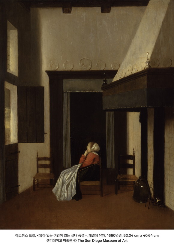 페르메르의 실내 풍경화에 영감을 준 선구자 프렐의 이 작품에는 서글픈 비밀이 있다. 1928년 실시된 분석 결과, 배경의 어두운 공간은 원래 병든 여인의 임종을 연상시키는 장면이 그려져 있었으나(사진 참조) 20세기 초 미술 시장에서 ‘판매에 불리하다’는 상업적 이유로 인위적으로 덧칠되어 가려졌음이 밝혀졌다. 작품 손상의 우려로 원화는 복원하지 않고 검은 공간은 그대로 남게 되었는데, 깊은 어둠 속의 비화가 고요한 슬픔의 깊이를 더한다. 검은 공간 속으로 사라져 버린 여인의 모습을 상상하며 감상의 묘미를 즐겨보자