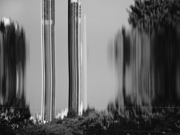 이 이미지는 ‘젤로 이펙트(Jello Effect)’로 인한 현상으로 카메라의 기계적 오류에 의해 발생된 것이다. 고해상도 카메라의 이미지 센서는 단위 면적당 스캔해야 할 정보량이 많아 이미지를 읽는 데 시간이 걸리고, 그 과정에서 카메라가 움직이면 화면이 젤리처럼 왜곡된다. 작가는 이 기술적 결함을 의도적으로 활용해 더 나은 삶을 약속했던 도시개발이 경제위기와 이해관계의 충돌로 좌절된 현실을 은유적으로 드러낸 것이다.