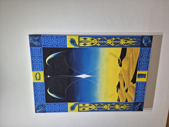 ‘The Last Supper’(2025)는 검정을 주조색으로 삼아 ‘최후의 만찬’(1495-1498)의 구도를 재현하며, 그 위로 부유하는 노란 박쥐와 붉은 비둘기의 형상은 원작의 상징적 질서를 벗어나 이미지의 위계와 의미망을 새롭게 엮어낸다.