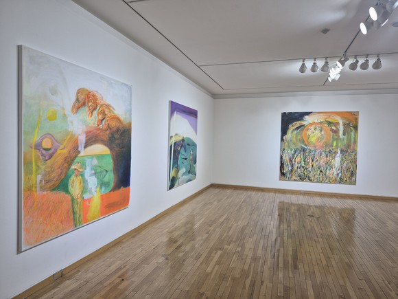 서 작가는 자신의 그림에 대해 이렇게 말했다. “3층의 두 공간에서 제가 생각하는 시간의 규모나 제가 느꼈던 이야기, 상상을 그림으로 풀어냈는데, 바깥 전시실은 낮의 무대라고 생각하고 그림을 그렸고, 안쪽 전시실의 작품은 밤의 무대라는 생각으로 그림을 그렸습니다. 안쪽 방의 4개의 큰 그림들은 계절들이라는 제목으로 인생의 봄, 여름, 가을, 겨울을 그려봤어요. 예를 들어 겨울 그림은 환상의 이미지들이 위에 비춰져 있고 아래에 얼어 있는 호수를 그려, 커다란 얼굴의 형상처럼 표현했습니다. 가을 같은 경우에는 중년의 모습을 생각하면서 저도 이제 곧 맞이할 시간을 생각했어요. 주변에 있는 작가들을 관찰하며 그림을 그렸는데 겉으로 보기에는 너무 잘하고 있지만 그들만의 고민이 많고 그래서 마치 나무들처럼 꽉 막혀 있는 것 같은 모습을 옆에서 지켜보면서 앞이 꽉 막힌 나무들이 하나의 길처럼 보였으면 좋겠다고 생각했어요.”