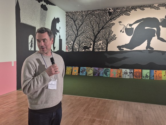 발란트 자코 작가는 "부산에 열흘간 머물면서 벽화 작업을 했다. 아래의 꽃 패널들은 만질 수도 있고 옮길 수 있어 서사를 관람객이 바꿀 수 있다"라고 말했다.:.